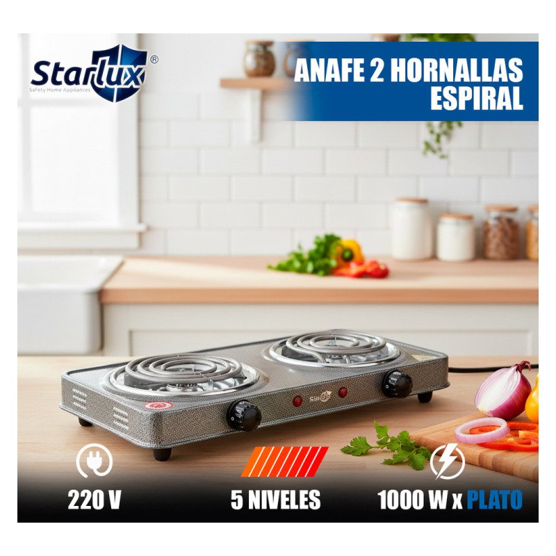 El Anafe Cocina Cocinilla Eléctrico 2000w Dos Hornallas Gris modelo SHP-5813 es la solución ideal para quienes buscan eficiencia y funcionalidad en la cocina. Con una potencia de 2000w, este anafe permite preparar tus platillos favoritos de manera rápida y efectiva, gracias a sus dos hornallas que ofrecen un control preciso de la temperatura mediante perillas.