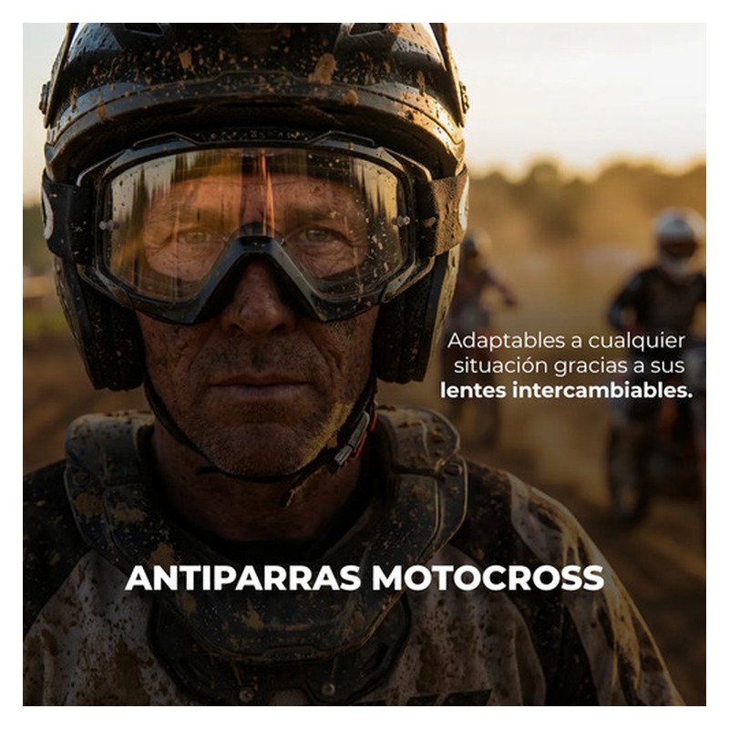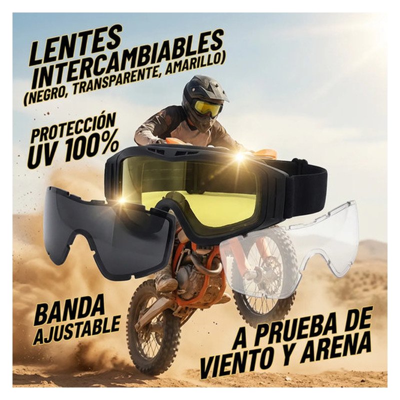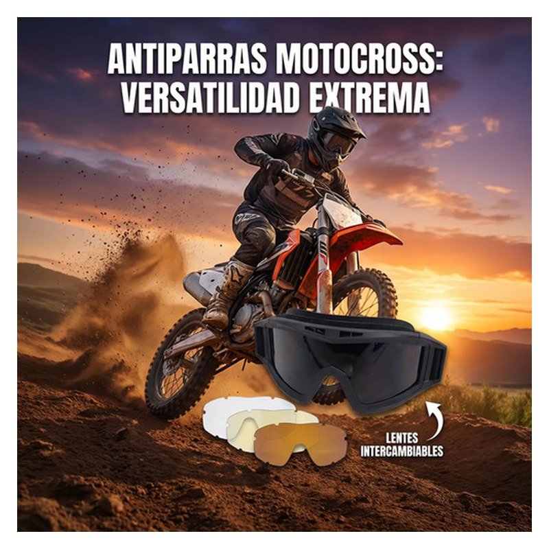 Las antiparras negras para moto con tres lentes en amarillo, gris y transparente son la elección ideal para los motociclistas que buscan un rendimiento óptimo y estilo en cada viaje. Diseñadas para un estilo de conducción deportivo, estas antiparras ofrecen una visión clara y protección contra el viento y los elementos, permitiendo que te concentres en la carretera.