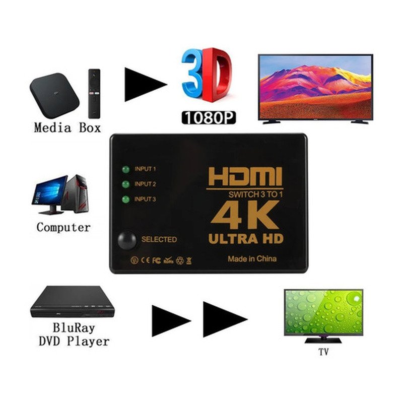 Divisor De Señal Hdmi Con Interruptor 3×1 Y Audio Y Vídeo Uhd 4k