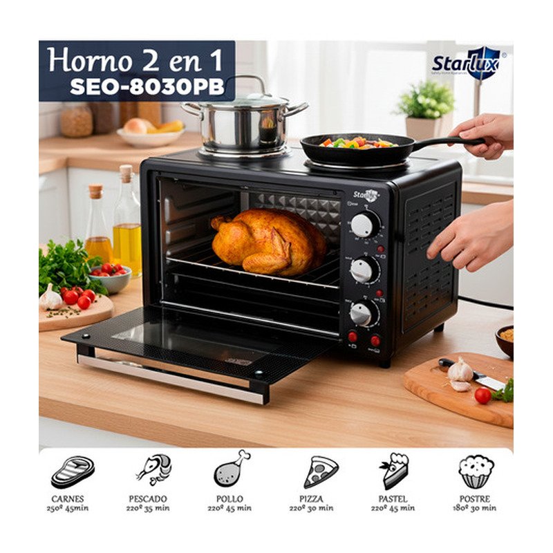 El Horno 2 en 1 Eléctrico Doble Anafe Plato Liso Starlux 30L es la solución ideal para quienes buscan versatilidad y eficiencia en la cocina. Con una capacidad de 30 litros, este horno permite preparar múltiples platillos al mismo tiempo, optimizando tu tiempo y esfuerzo. Su diseño de mesa se adapta perfectamente a cualquier espacio, brindando comodidad y funcionalidad.