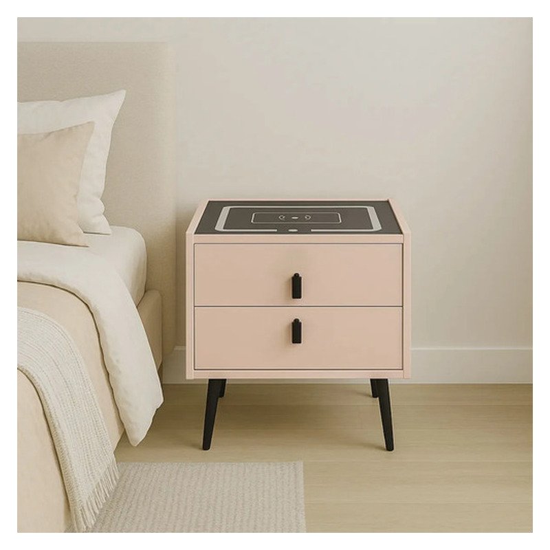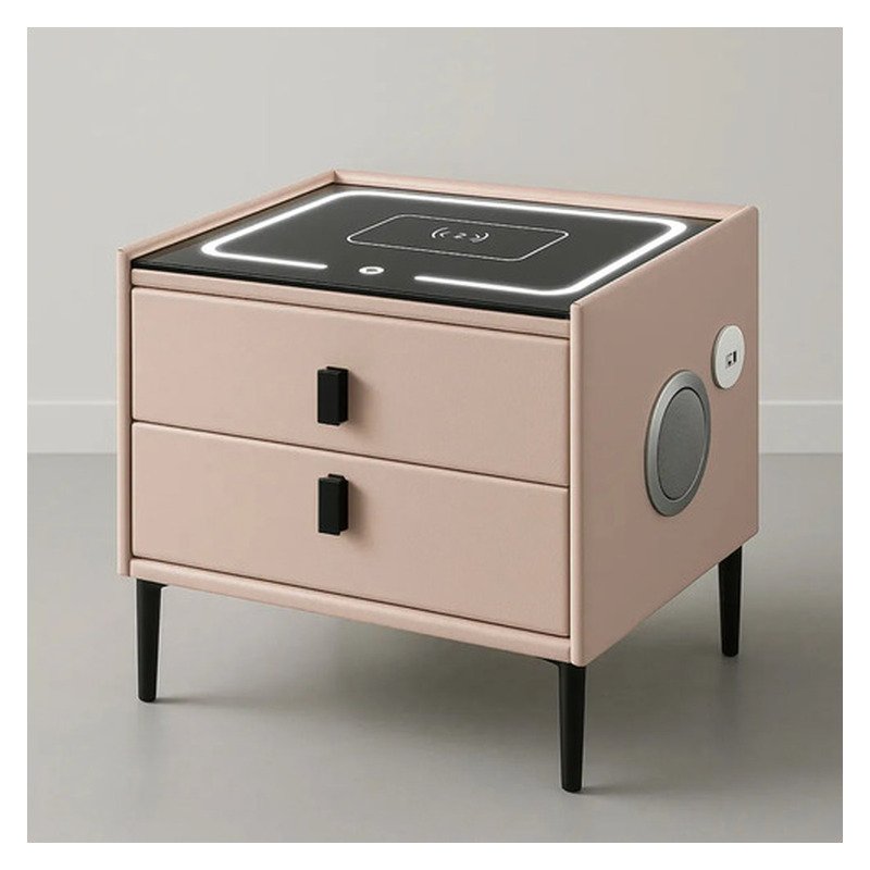 Con unas dimensiones de 48 cm de altura, 48 cm de ancho y 40 cm de profundidad, esta mesa es compacta y práctica. Dispone de dos cajones con correderas de metal, ofreciendo un amplio espacio de almacenamiento para tus objetos personales. Además, su sistema de carga inalámbrica y parlante integrado la convierte en un elemento multifuncional que optimiza tu experiencia diaria.