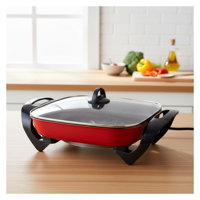 Olla Sartén Eléctrica Tapa Vidrio Antiadherente 5 Litros Rojo