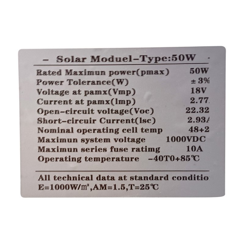 El panel solar monocristalino de 50W y 12V es una excelente opción para quienes buscan soluciones energéticas sostenibles y eficientes. Con celdas de alta calidad, este panel ofrece una potencia máxima de 50W, lo que lo convierte en una fuente confiable de energía solar para diversos dispositivos y aplicaciones.