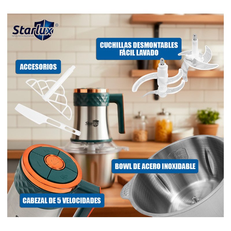 A la hora de elaborar tus platos favoritos, todas tus necesidades estarán cubiertas fácilmente con esta multiprocesadora Starlux. Descubrí una nueva forma de cocinar y sorprendé a tu familia con las preparaciones más ricas. Este electrodoméstico logrará transformar los alimentos en el menor tiempo y se convertirá en tu ayudante imprescindible en la cocina.